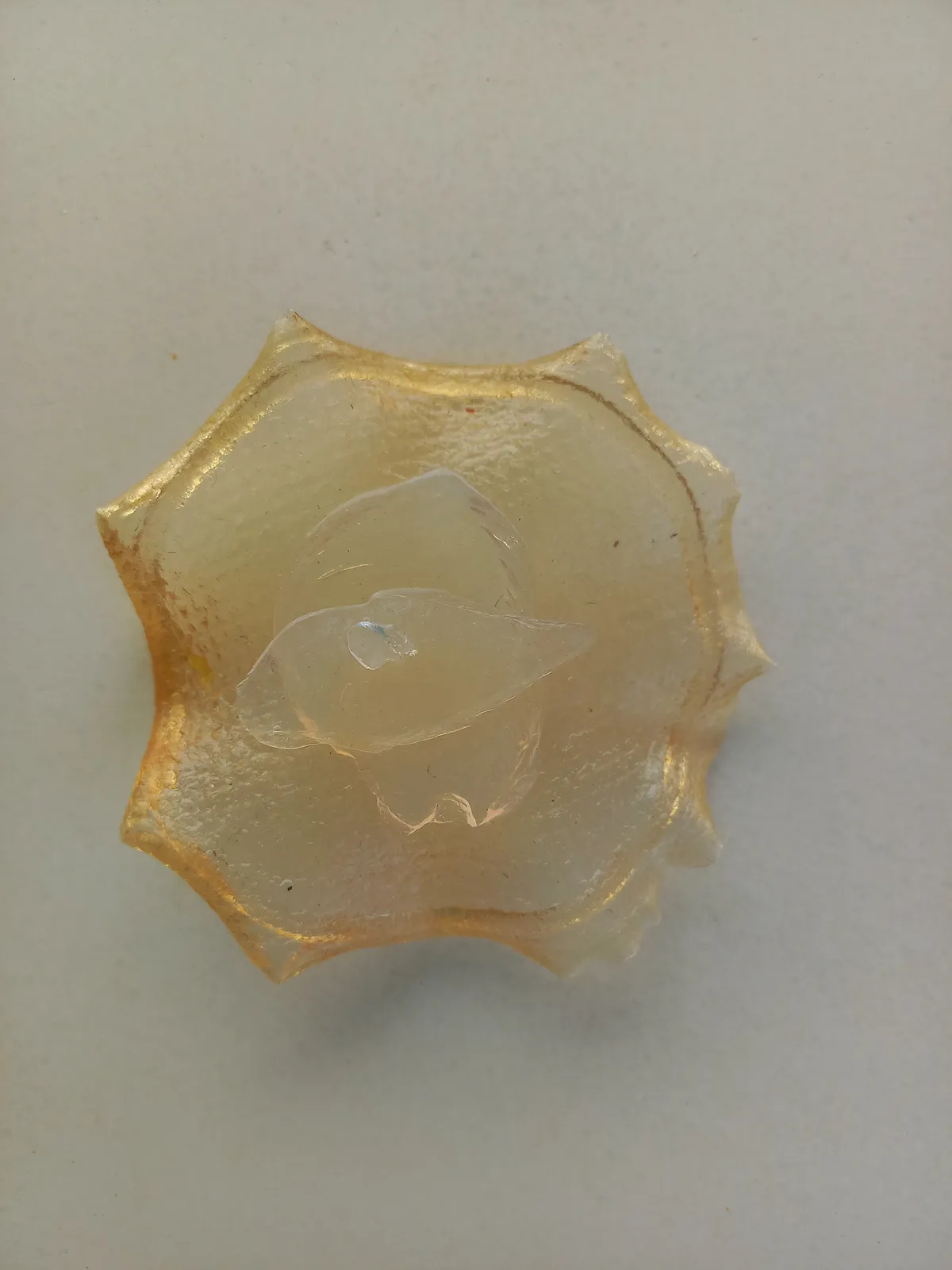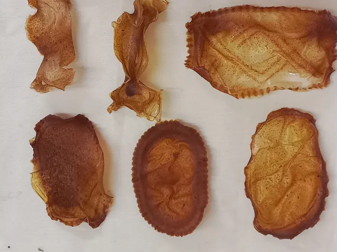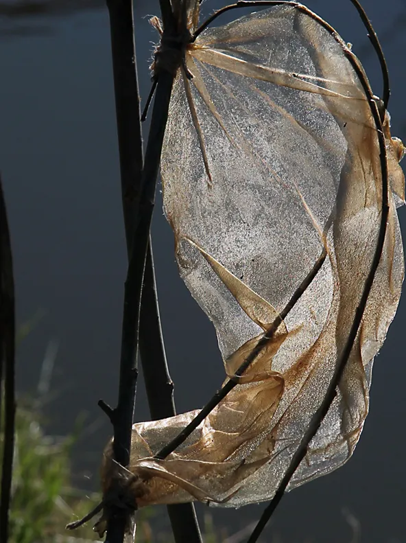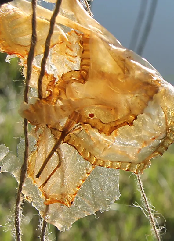 Piezas fabricadas en biomateriales. Las mismas dan cuenta de las formas orgánicas que referencian a los macroinvertebrados que se encuentran en el agua.